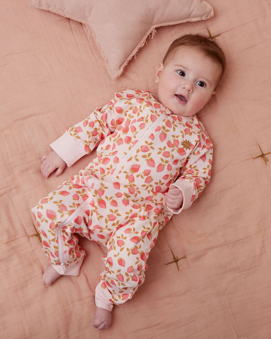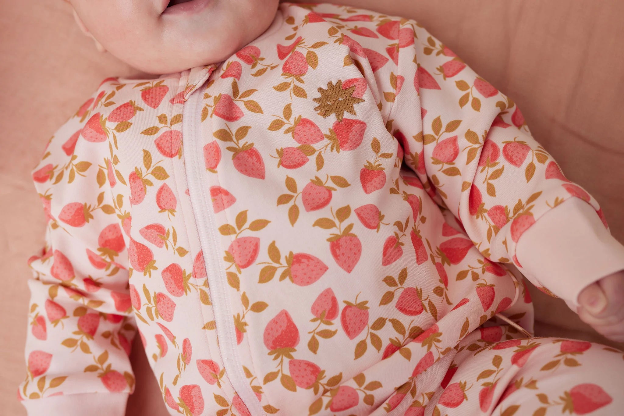 Sweet strawberry vibes wrapped up in one adorable package! This all-in-one playsuit brings fruity fun to your little one's wardrobe with its charming strawberry design. Soft, stretchy, and oh-so-comfy, it's perfect for kids who love their fruit and fashion in equal measure. Whether they're playing in the garden or snuggled up indoors, this delightful piece keeps them looking cute and feeling great all day long. A strawberry-sweet addition to any kid's collection!