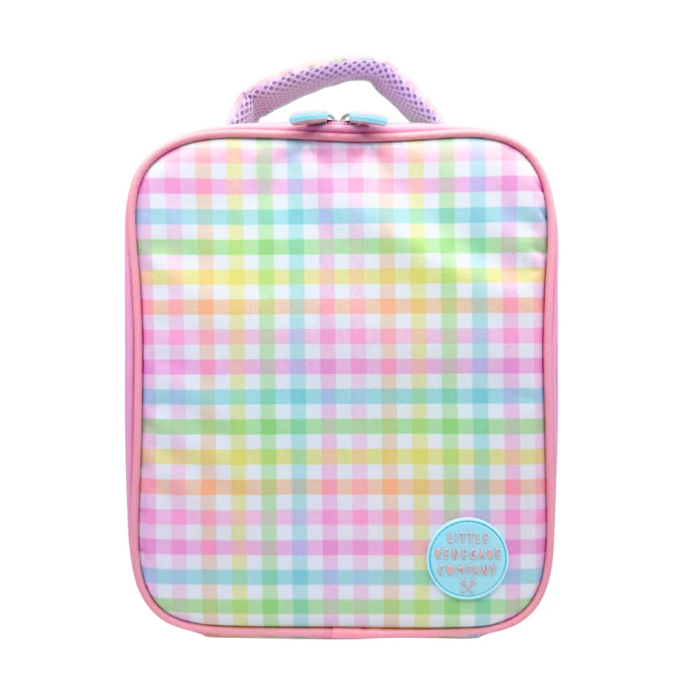 The Sherbert Insulated Lunch Bag features a dreamy pastel gingham print in soft sherbert tones on a crisp white background. Loved by kids and mums alike, it brings a little sweetness to lunchtime while delivering serious functionality.