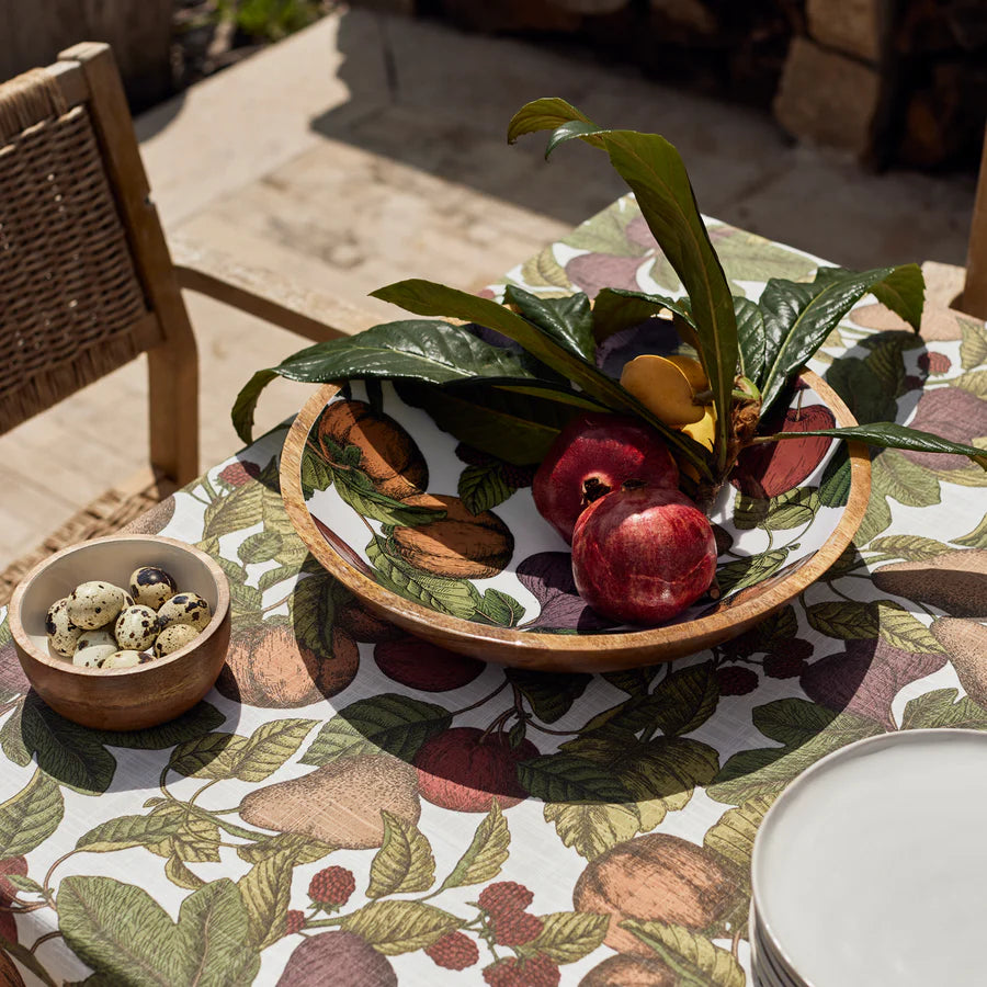Hand-painted fruit design on enamel with mango wood base. Available in coordinating products. Designed in-house. Suitable for cold food only.