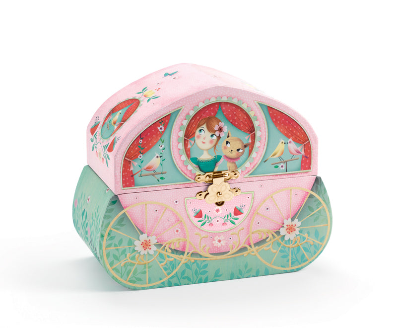 Elegant carriage shaped music box with princess and cat characters.