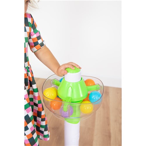 The fun is in the suspense! Fill the top of the tower with the 16 colorful balls and then press the button. A hidden timer starts ticking away until suddenly... CLICK. All the balls are dropped at once to be sent rolling in all directions! Quick! Gather them up and do it all again! Spill Again is an active surprise kids will love to wait for time and time again.