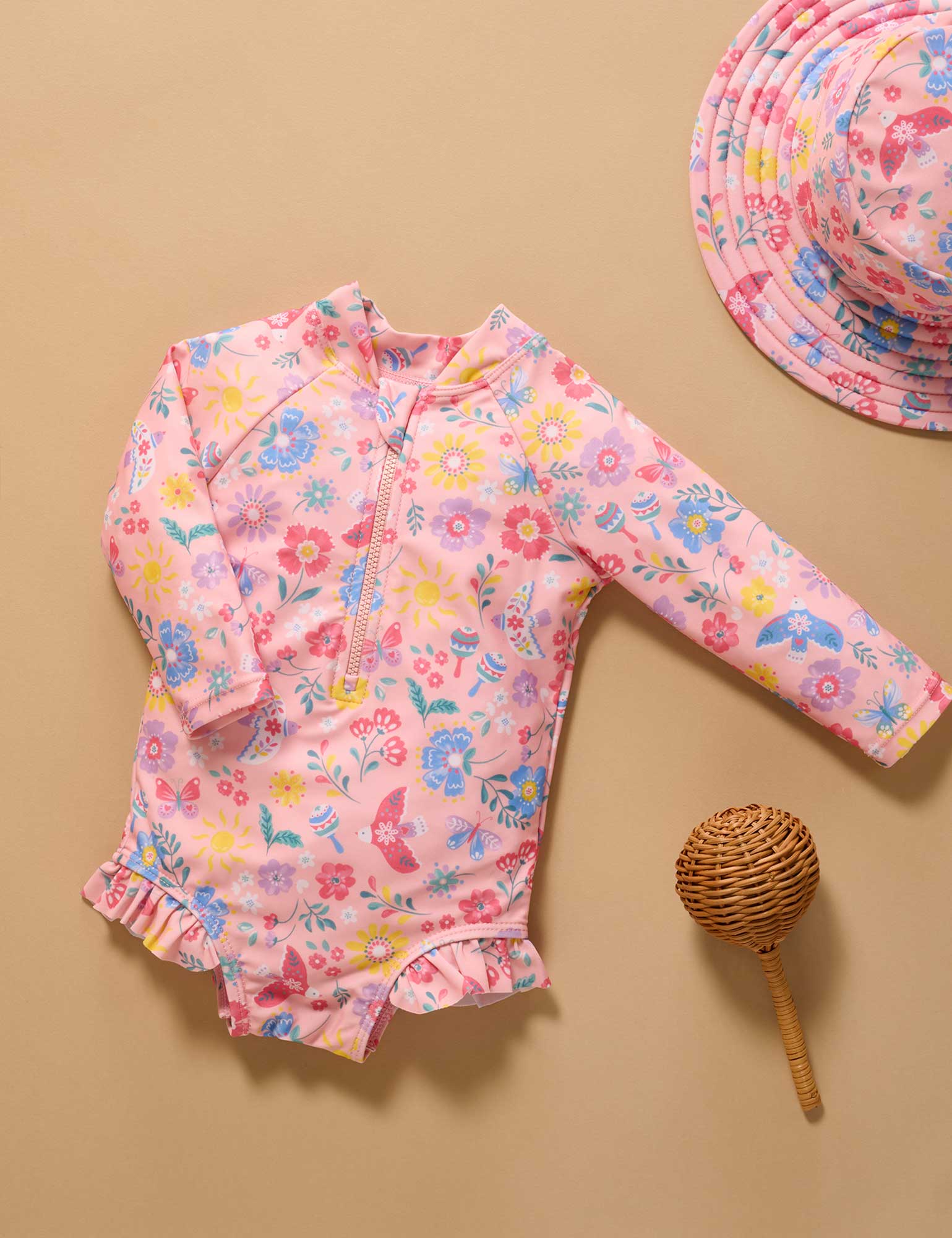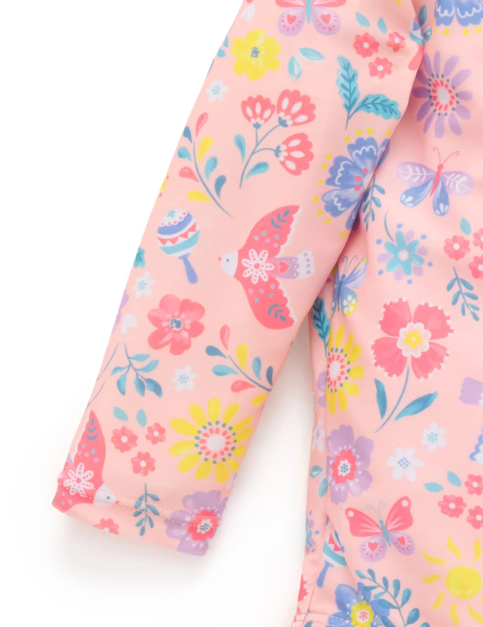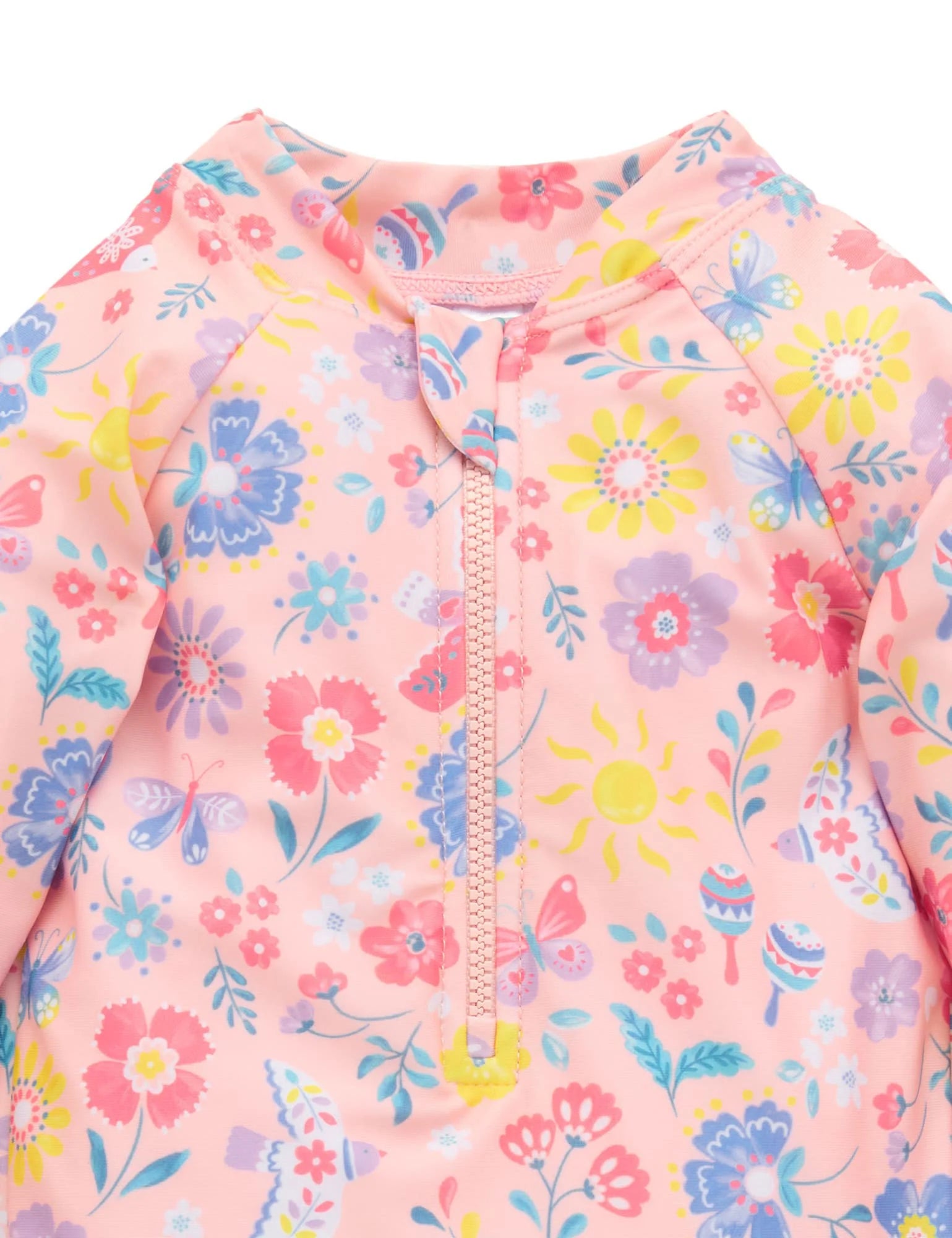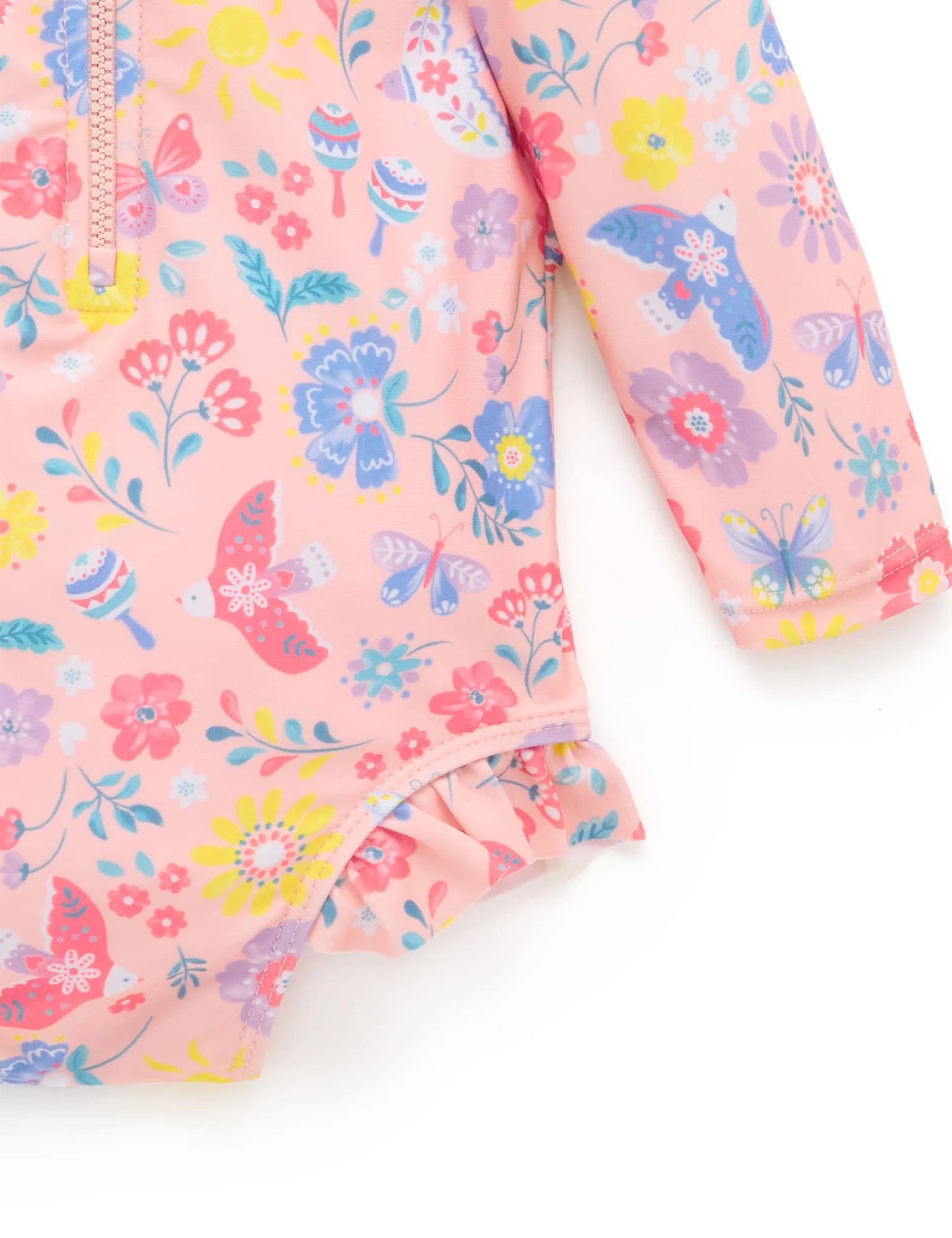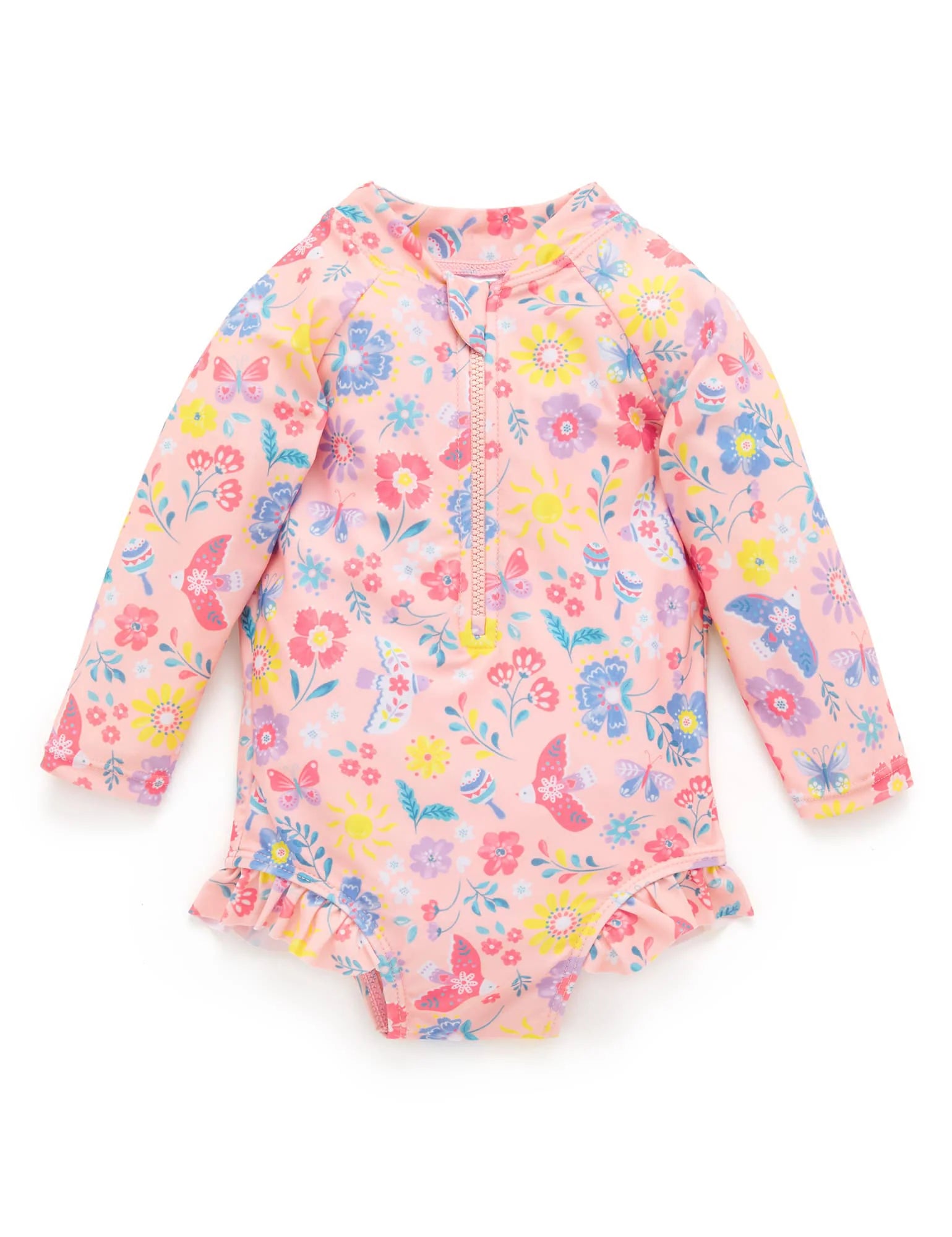 Purebaby's classic Long Sleeve Swimsuit is perfect for those long days at the beach or by the pool. Featuring a front zip with safety fold for easy dressing, ruffle trimmings and a sweet all over print. Made from a recycled polyester and elastane blend for a lightweight and breathable suit.
