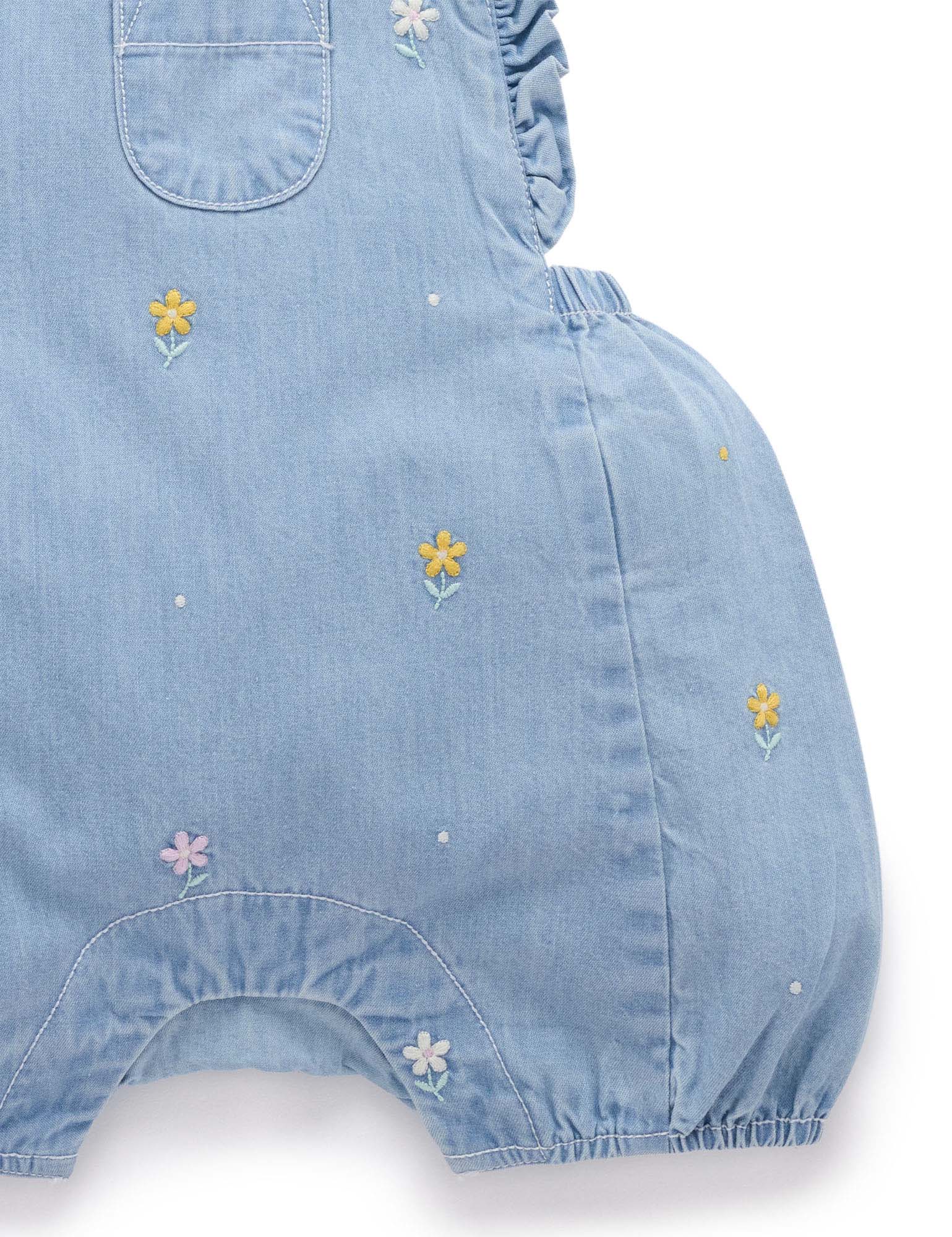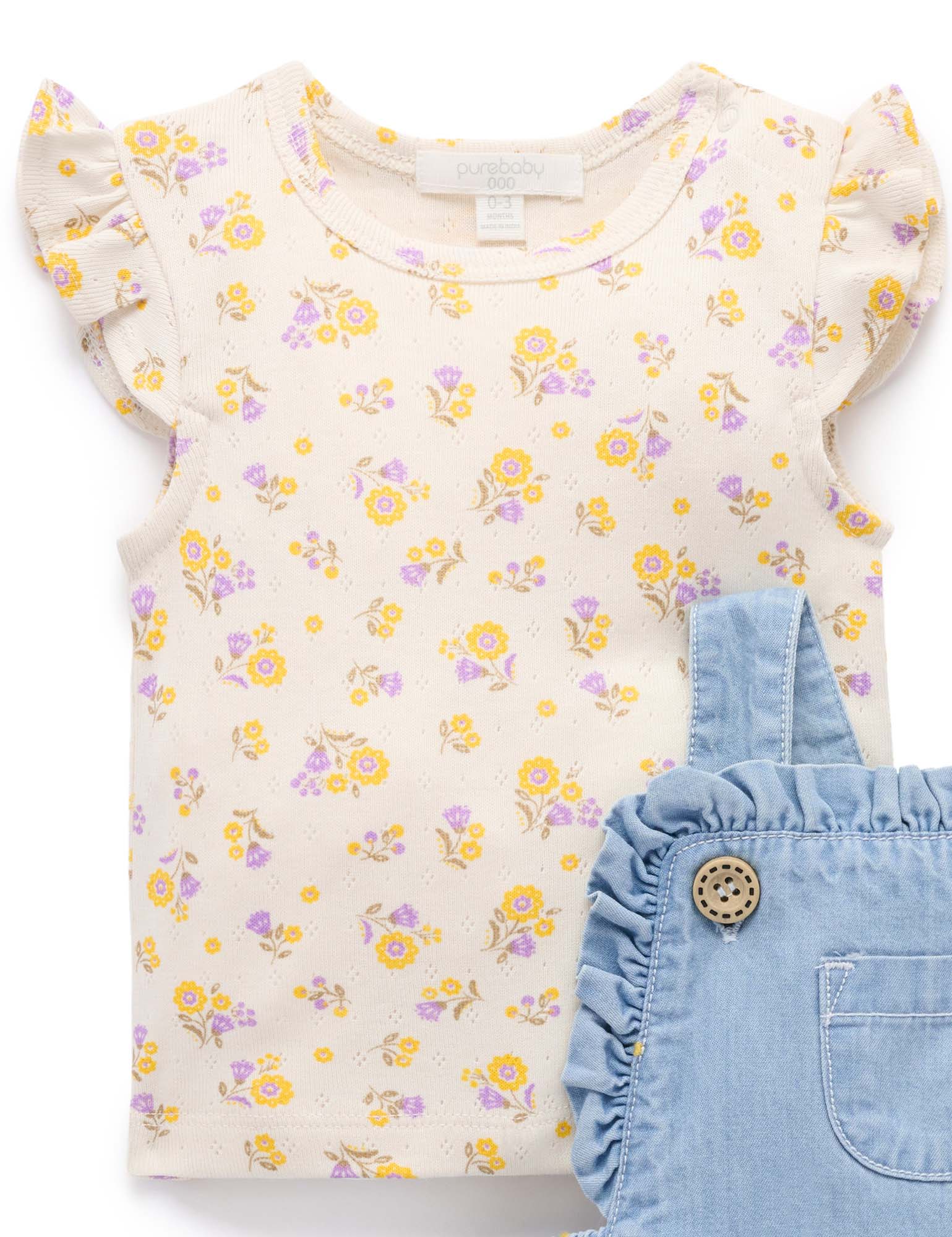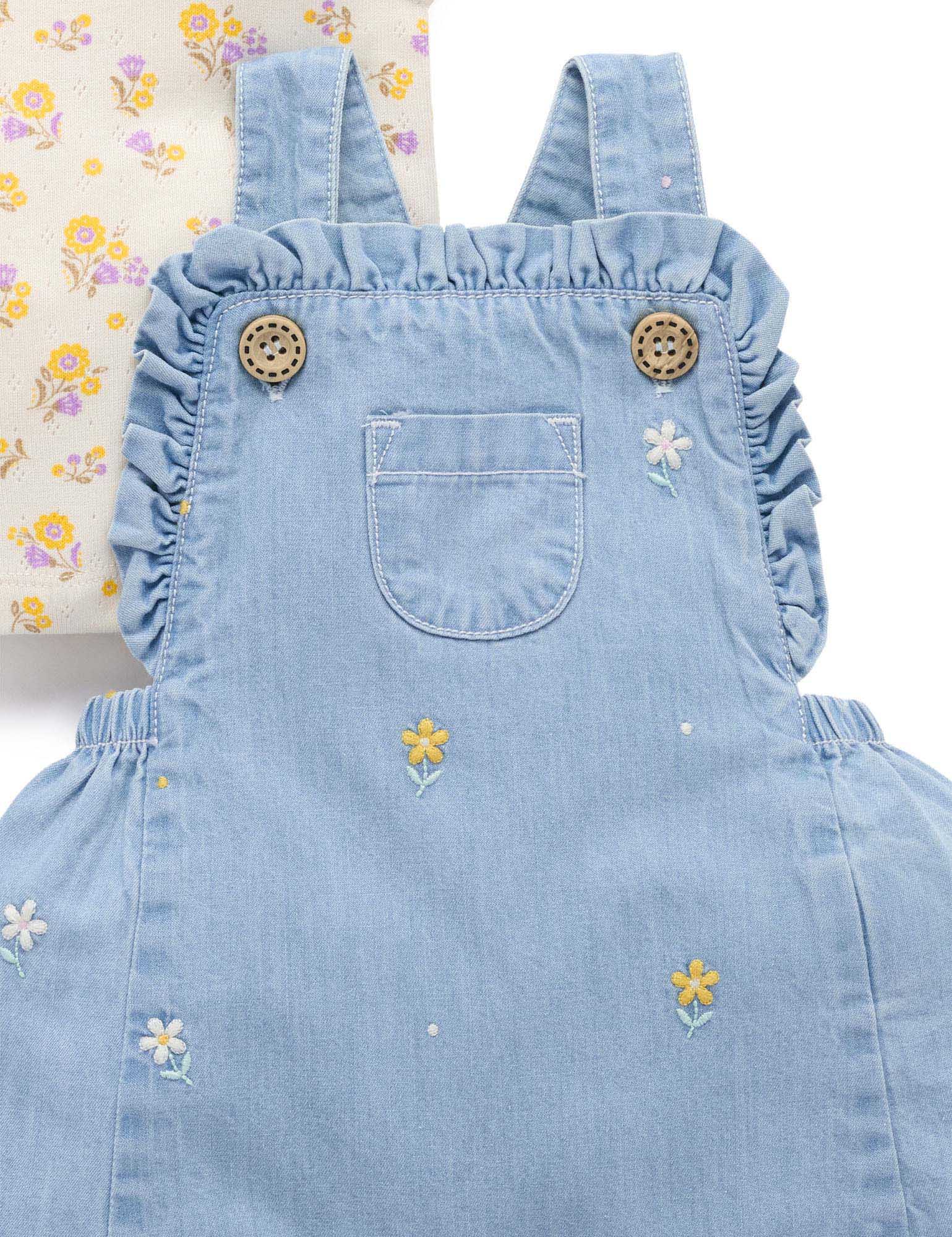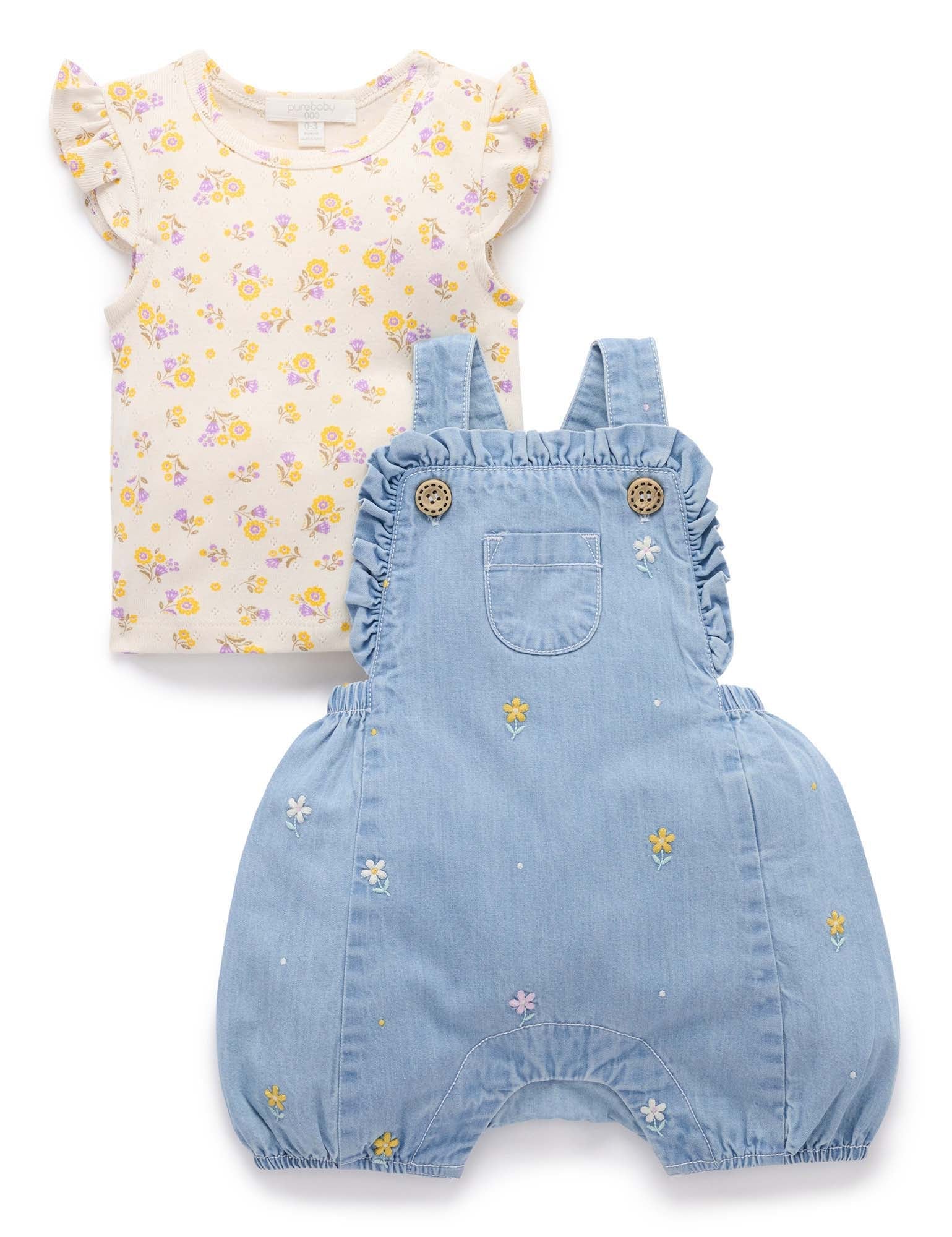 Purebaby's Daisy Broderie Overall Set is the sweetest 2 piece for summer play. Featuring our soft denim overalls with a pretty all over floral embroidery, and basic floral tee for layering. Made from 100% Cotton for a soft and breathable set. Wear together, or mix and match with your other items.