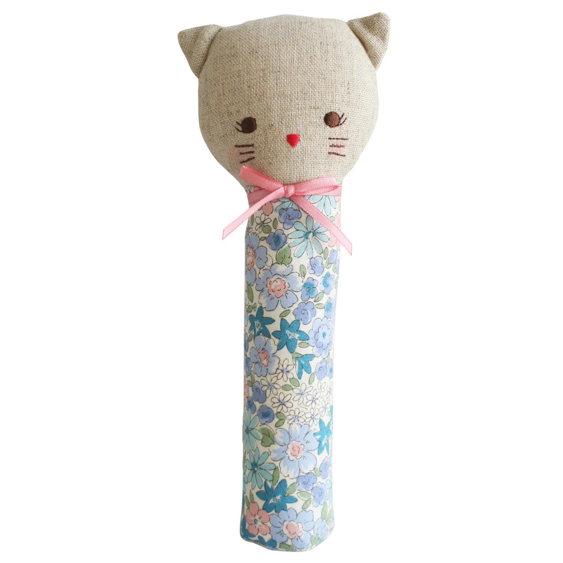A gorgeous kitty squeaker toy. Squeaks easily when gently shaken or squeezed. A beautifully made safe toy that is perfect for young babies to explore their grasp reflex from birth & then later at around 4-5 months they are delighted by the squeaking sound & will learn to squeak independently by watching you. Squeakers are a great distraction toy! An absolute must-have in the baby bag!