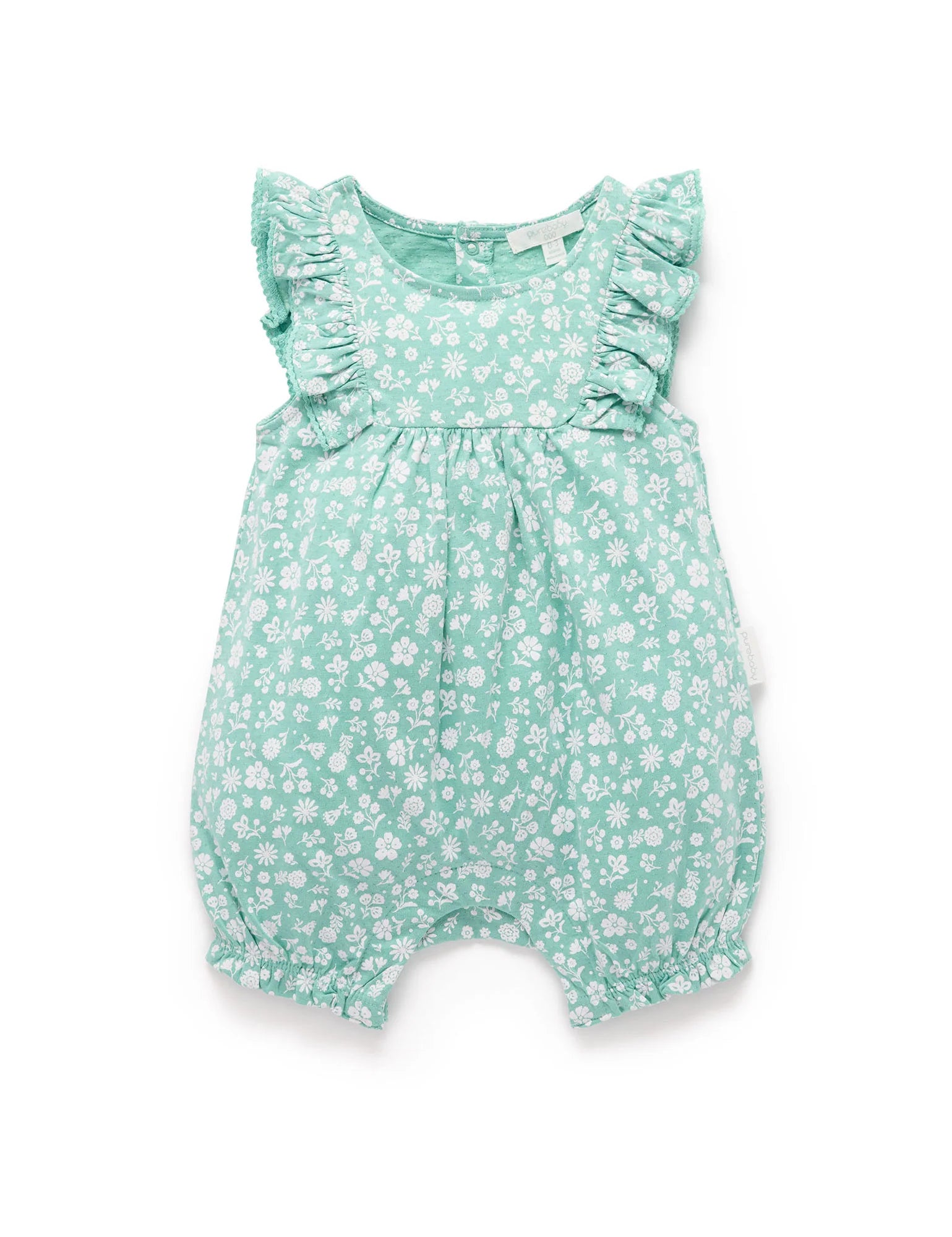 Purebaby's Ruffle Shortie Growsuit is the perfect lightweight summer romper. Featuring sweet ruffle trimming at the shoulders and an all over floral print. Designed as a balloon style, with snap clips for easy dressing and gathers around the legs for a comfortable fit. Made from the softest 100% Organic Cotton for a breathable outfit.