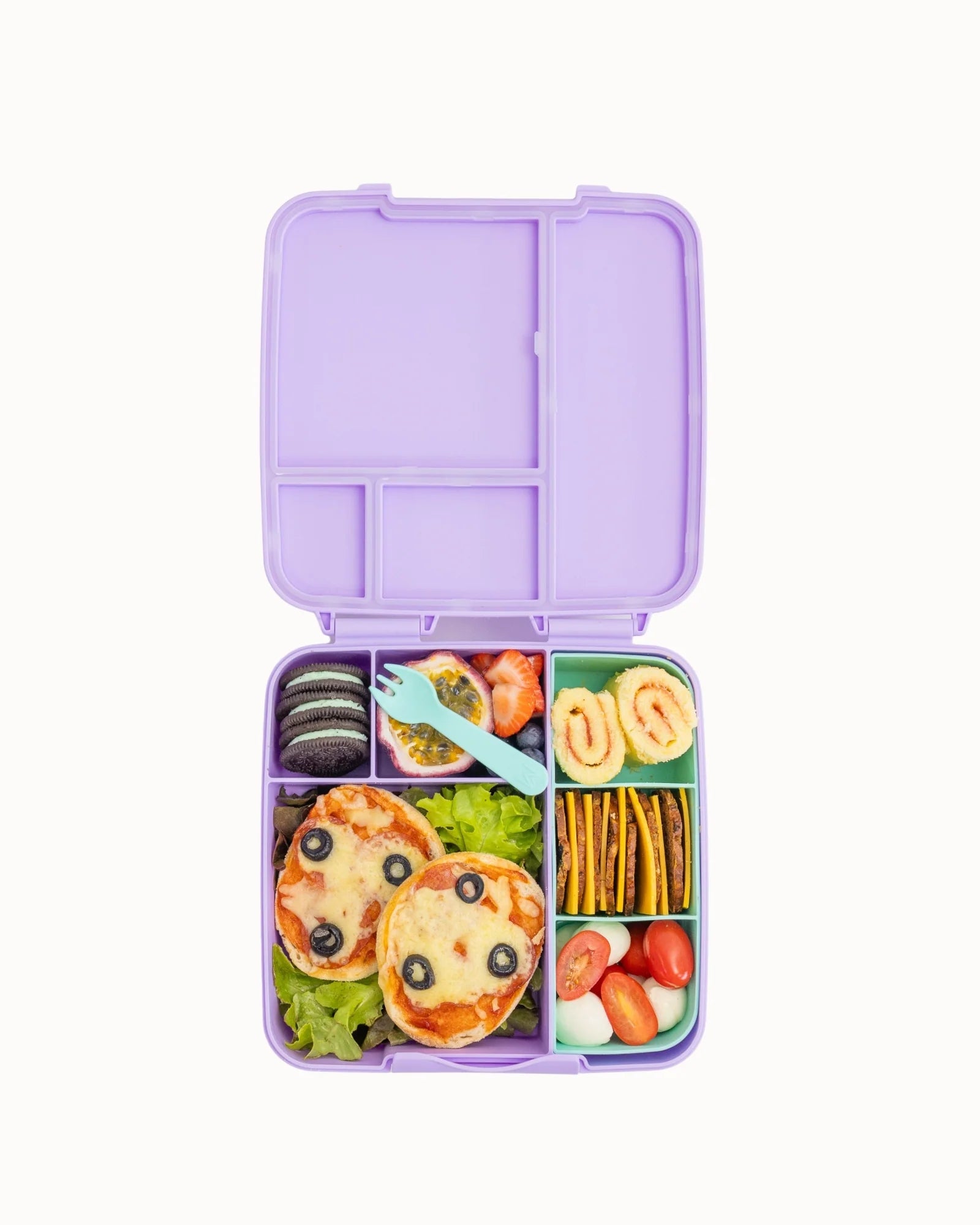 Pack a whole sandwich (crusts on!), hot dog, wraps, or even croissants. Don’t forget there’s still room for yoghurt pouches or a whole banana, small apple, fruit, veggies, crackers and more!