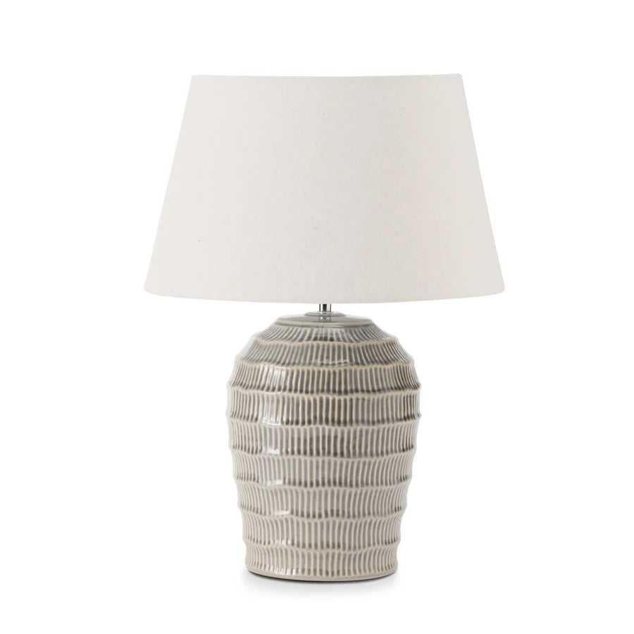 Light blue/grey ribbed table lamp with tapered shade.