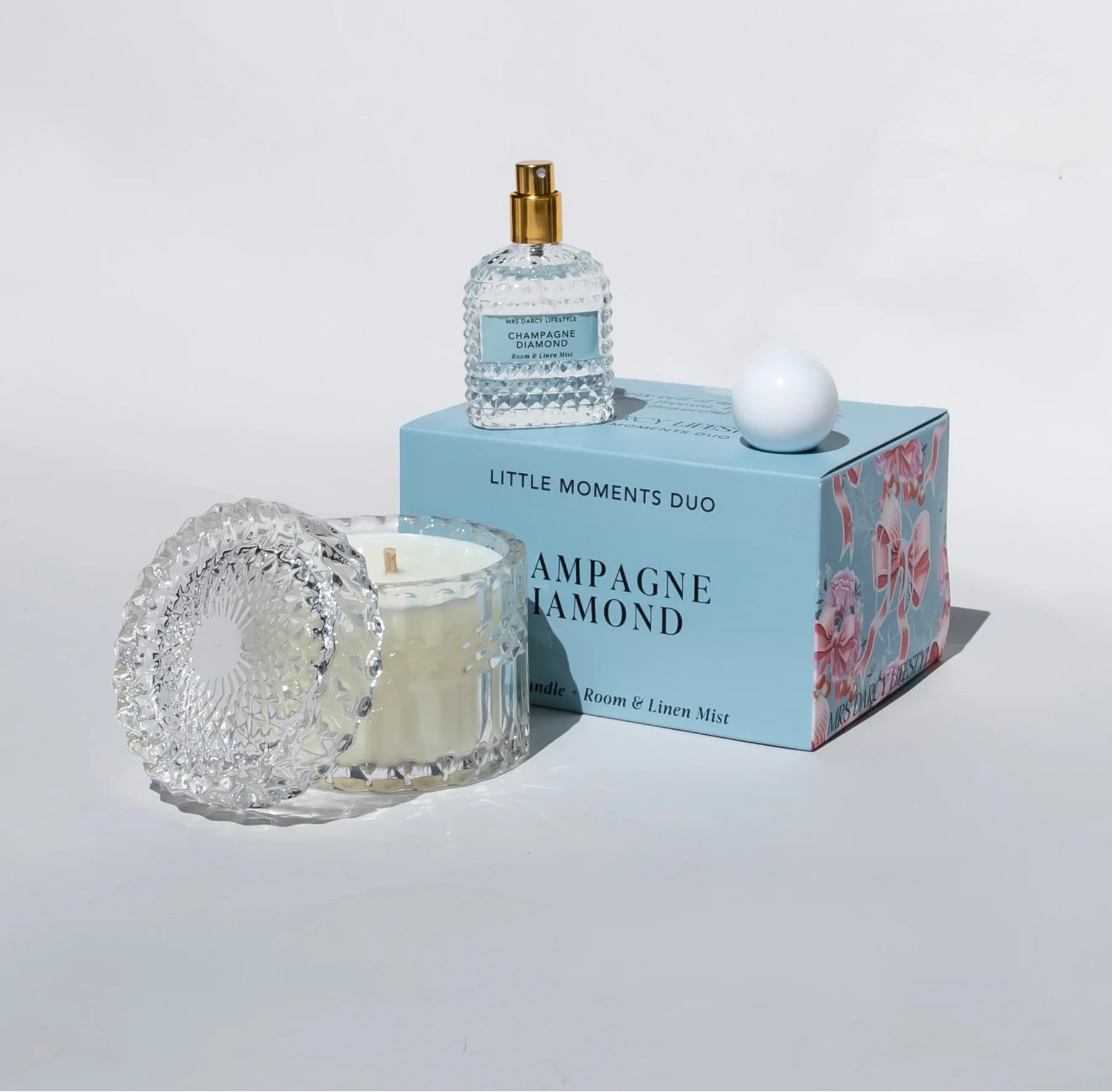Bring everyday luxury home with the Mrs Darcy Little Moments Duo in Champagne Diamond. The set includes a 190 g scented candle and a 30 ml linen mist, filling your space with a sparkling, sophisticated scent.
