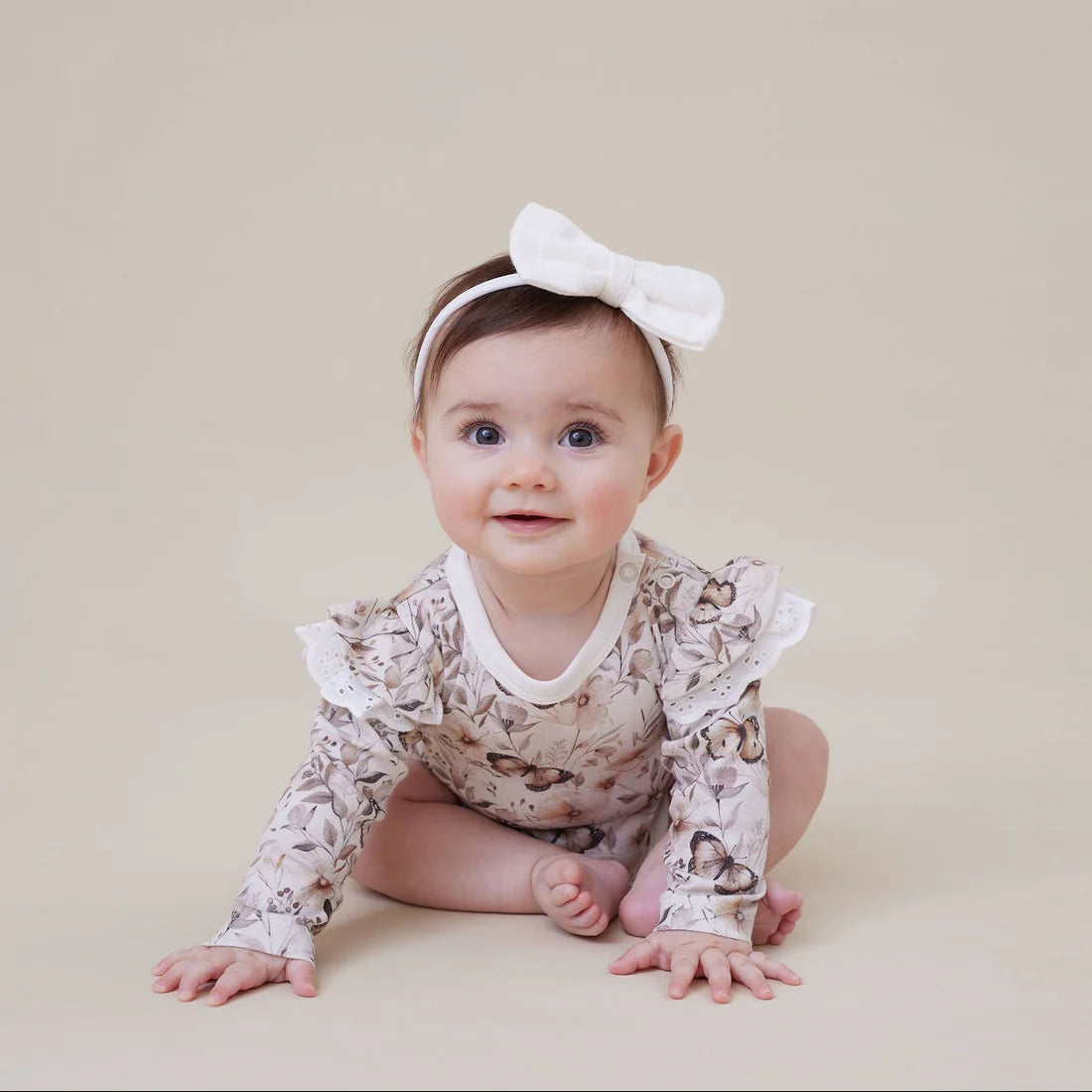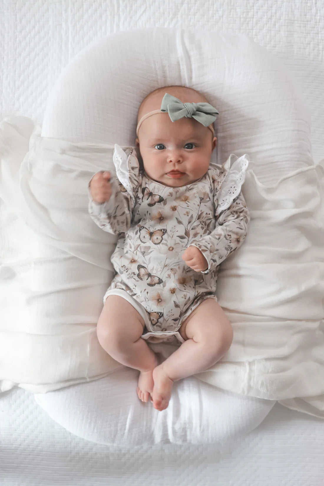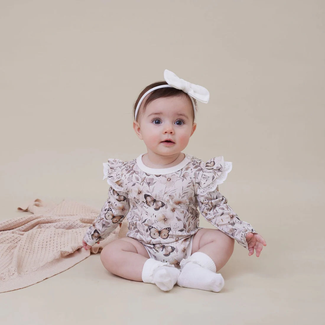 Capturing the beauty of nature is natural hues our Butterfly Fields Flutter Onesie is a sweet and feminine addition this season.
