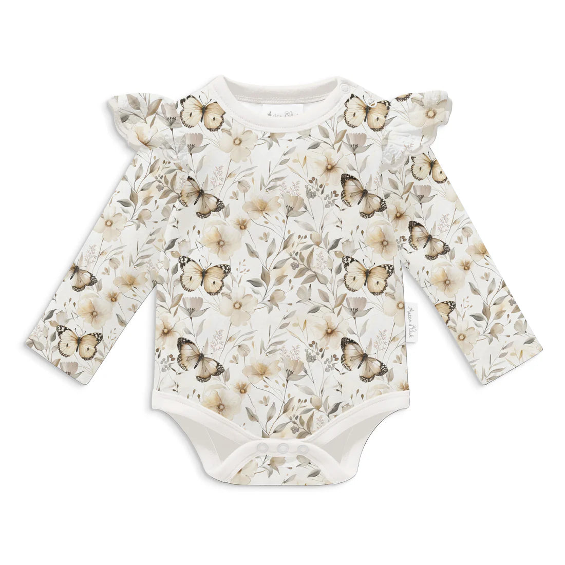 Featuring layered ruffles to the shoulder and an all over print of native florals and butterflies, the onesie is crafted from 100% GOTS certified organic cotton, making it gentle on delicate skin and wrapping your baby in breathable comfort.