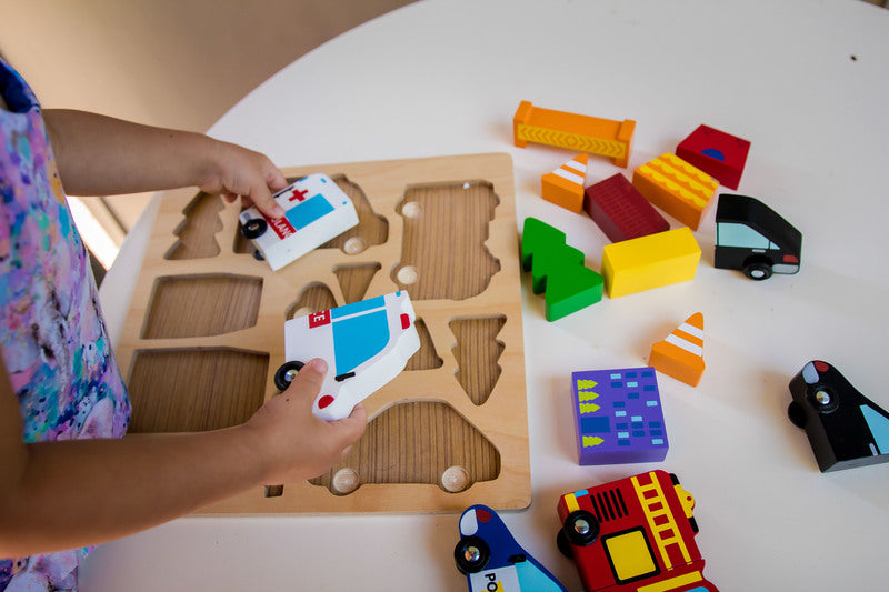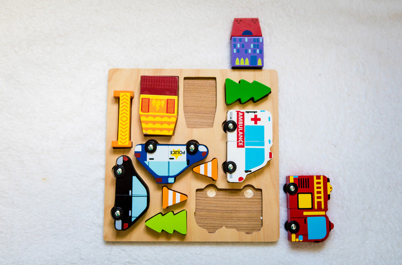 What adventure will you go on? A bright chunky car puzzle with emergency vehicles where the cars can be mixed and matched with magnetised pieces. The puzzle opens up a world of open-ended play with wooden trees, cones and buildings. The design includes fantastic solid shapes for young hands to manipulate. Puzzles are a great opportunity to grow your child's gross and fine motor skills, hand and eye coordination, problem-solving, shape and colour recognition skills.