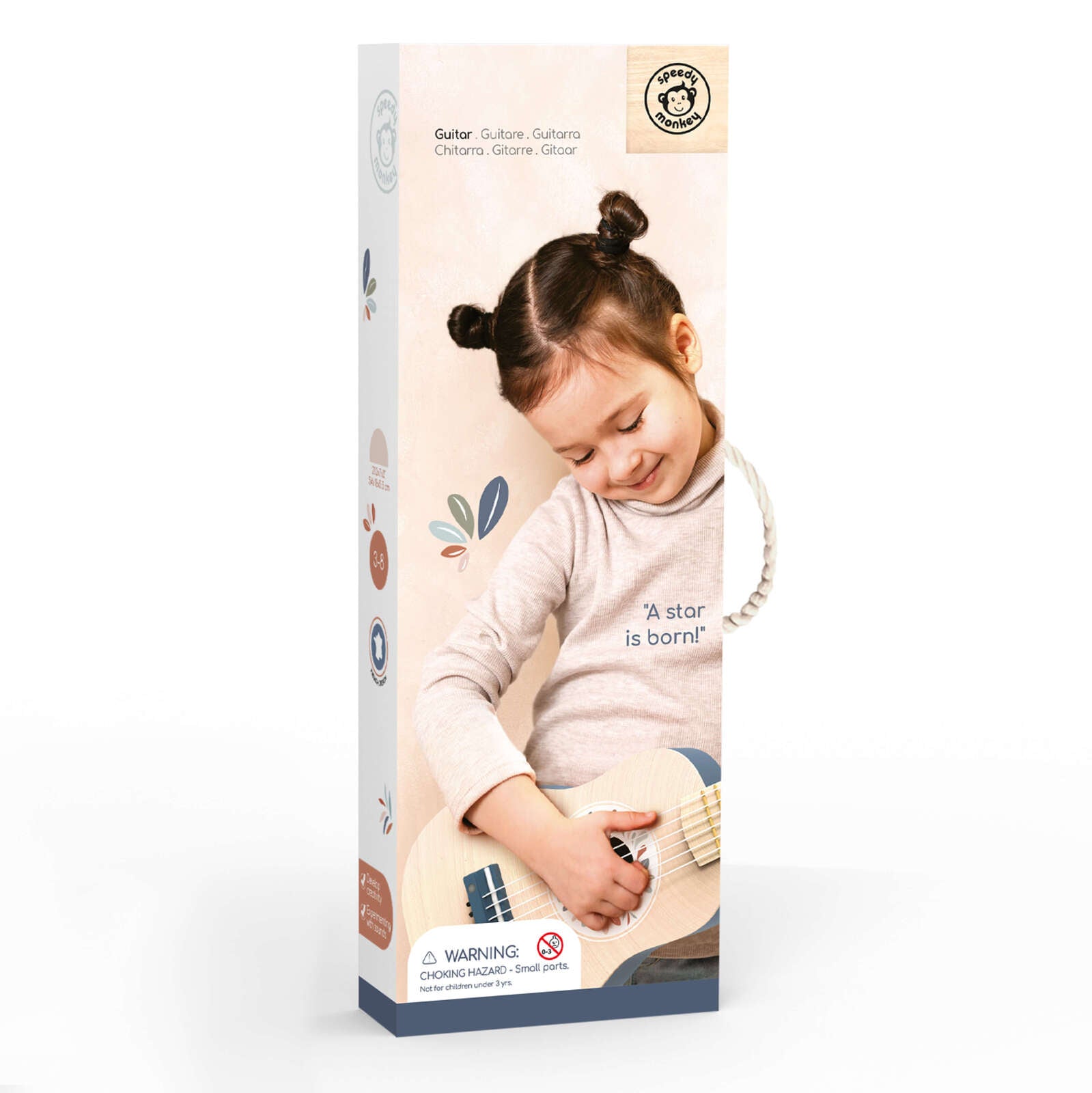 Music ignites all areas of child development, hence, this sturdy nylon six string toy guitar is a must have for your little one! The guitar is a calm blue and wooden colour with surface coating designed to prevent finger injuries. With it being easy to carry around, your child will enjoy the sound and actively strengthen and develop their musical talents anywhere at anytime. This toy is crafted from sustainably sourced wood from FSC® certified forests and coated with non toxic paint.